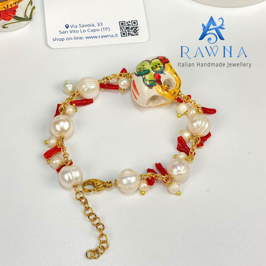 Bracciale Artigianale con Borsa in Ceramica di Caltagirone Fico d’India, Perle di Fiume e Corallo Naturale – RAWNA