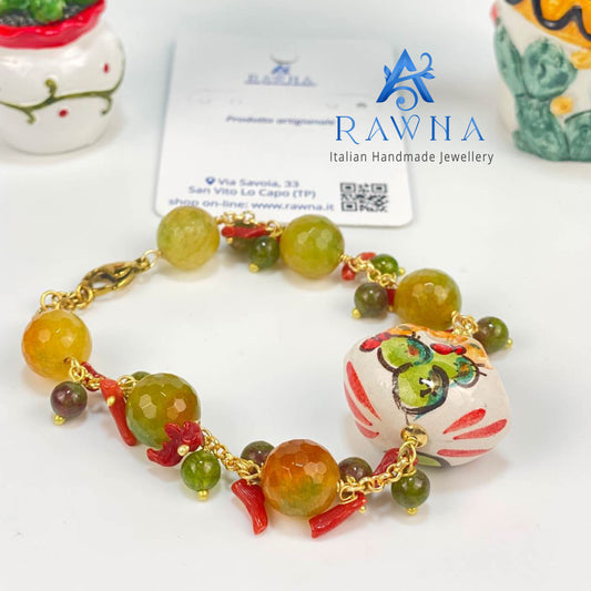 Bracciale Artigianale con Borsa in Ceramica di Caltagirone, Agata Verde e Corallo – RAWNA Sicilia