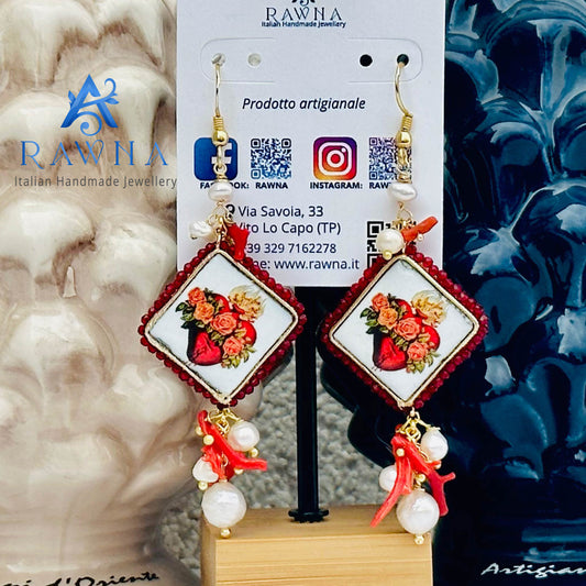 a Orecchini mattonella in pietra lavica di Etna con cuore con le rose al centro